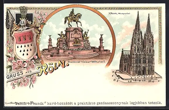 Lithographie Köln, Denkmal Kaiser Wilhelm I., Dom, Westportal, Wappen