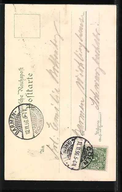 Personenbezogene Daten auf der Rückseite der Karte wurden durch blauen Textmarker unkenntlich gemacht. Die blauen Stellen sind auf die Vorderseite durchgeweicht und wirken sich negativ auf das Postkartenfoto aus