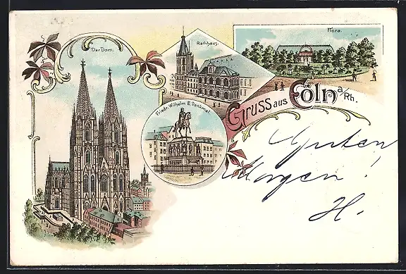 Lithographie Köln, Der Dom, Rathaus, Flora, Denkmal