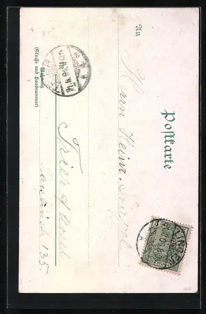 Personenbezogene Daten auf der Rückseite der Karte wurden durch blauen Textmarker unkenntlich gemacht. Die blauen Stellen sind auf die Vorderseite durchgeweicht und wirken sich negativ auf das Postkartenfoto aus