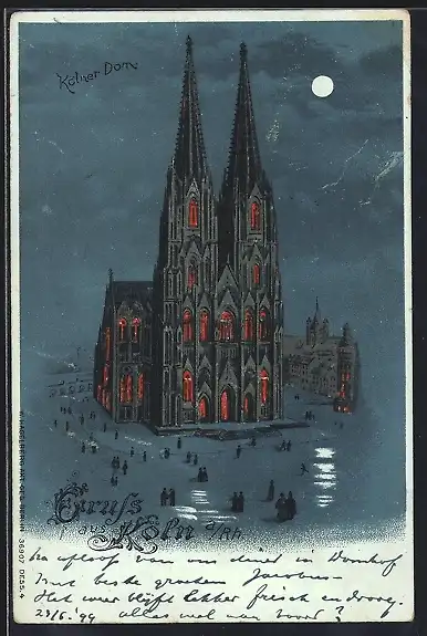 Lithographie Köln, Der Dom mit beleuchteten Fenstern