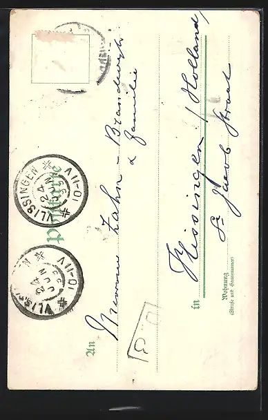 Personenbezogene Daten auf der Rückseite der Karte wurden durch blauen Textmarker unkenntlich gemacht. Die blauen Stellen sind auf die Vorderseite durchgeweicht und wirken sich negativ auf das Postkartenfoto aus