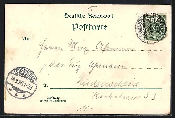 Personenbezogene Daten auf der Rückseite der Karte wurden durch blauen Textmarker unkenntlich gemacht. Die blauen Stellen sind auf die Vorderseite durchgeweicht und wirken sich negativ auf das Postkartenfoto aus