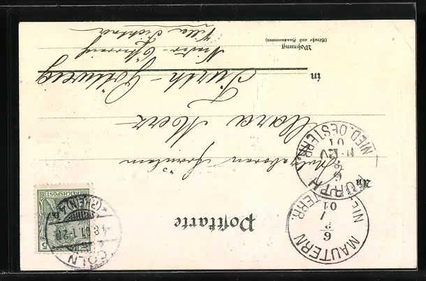 Personenbezogene Daten auf der Rückseite der Karte wurden durch blauen Textmarker unkenntlich gemacht. Die blauen Stellen sind auf die Vorderseite durchgeweicht und wirken sich negativ auf das Postkartenfoto aus
