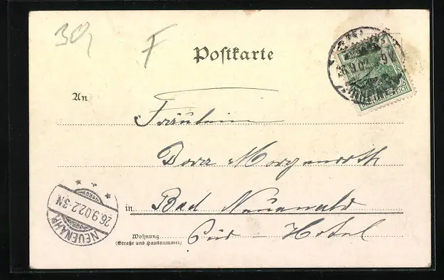 Personenbezogene Daten auf der Rückseite der Karte wurden durch blauen Textmarker unkenntlich gemacht. Die blauen Stellen sind auf die Vorderseite durchgeweicht und wirken sich negativ auf das Postkartenfoto aus