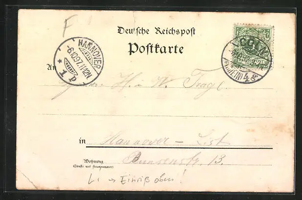 gelaufen 1897, Eckknicke re., Einriss oben, sonst guter Zustand