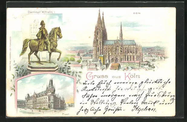 Lithographie Köln, Dom, Denkmal Wilhelm I., Post
