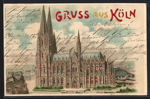 Lithographie Köln, Dom, Halt gegen das Licht: bunt leuchtende Fenster