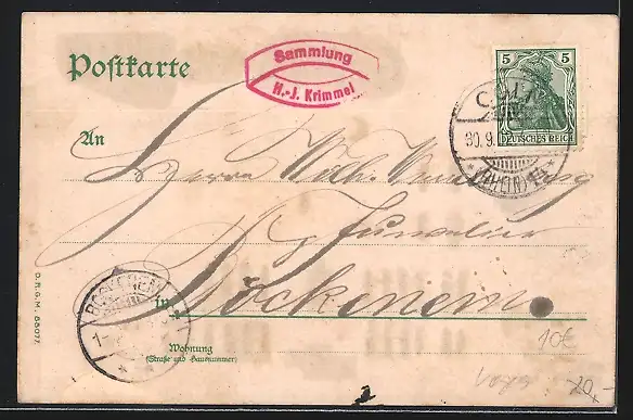Personenbezogene Daten auf der Rückseite der Karte wurden durch blauen Textmarker unkenntlich gemacht. Die blauen Stellen sind auf die Vorderseite durchgeweicht und wirken sich negativ auf das Postkartenfoto aus