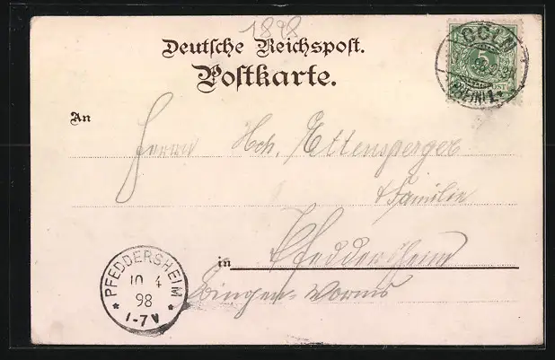 Personenbezogene Daten auf der Rückseite der Karte wurden durch blauen Textmarker unkenntlich gemacht. Die blauen Stellen sind auf die Vorderseite durchgeweicht und wirken sich negativ auf das Postkartenfoto aus