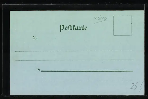 Personenbezogene Daten auf der Rückseite der Karte wurden durch blauen Textmarker unkenntlich gemacht. Die blauen Stellen sind auf die Vorderseite durchgeweicht und wirken sich negativ auf das Postkartenfoto aus