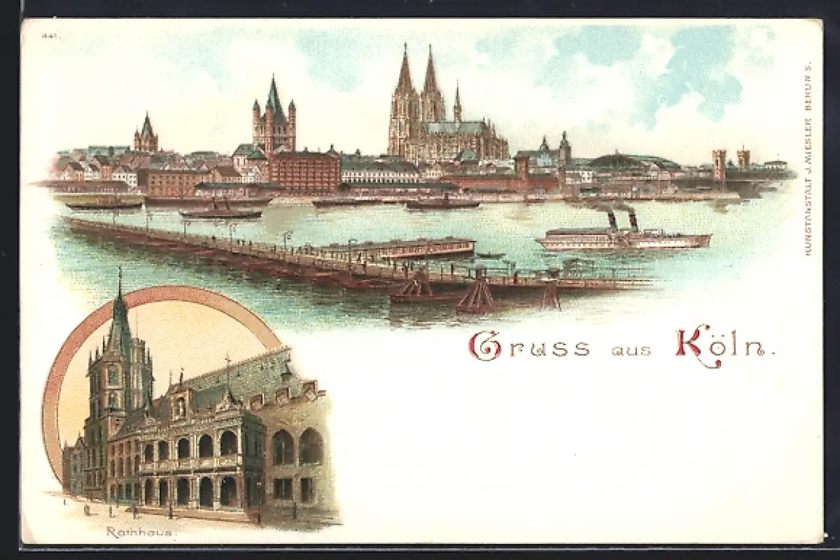 Lithographie Köln, Dom, Rheinpanorama, Rathaus