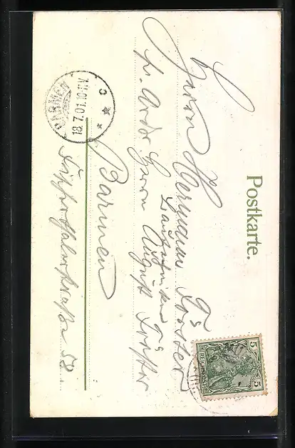 Personenbezogene Daten auf der Rückseite der Karte wurden durch blauen Textmarker unkenntlich gemacht. Die blauen Stellen sind auf die Vorderseite durchgeweicht und wirken sich negativ auf das Postkartenfoto aus