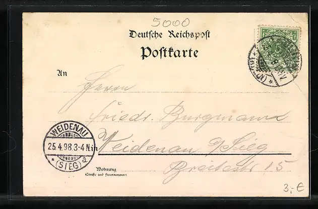 Personenbezogene Daten auf der Rückseite der Karte wurden durch blauen Textmarker unkenntlich gemacht. Die blauen Stellen sind auf die Vorderseite durchgeweicht und wirken sich negativ auf das Postkartenfoto aus