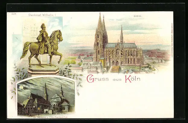 Lithographie Köln, Dom und Denkmal Wilhelm I.
