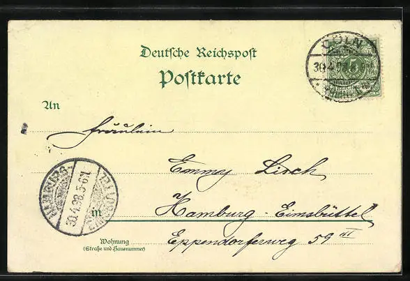 Personenbezogene Daten auf der Rückseite der Karte wurden durch blauen Textmarker unkenntlich gemacht. Die blauen Stellen sind auf die Vorderseite durchgeweicht und wirken sich negativ auf das Postkartenfoto aus