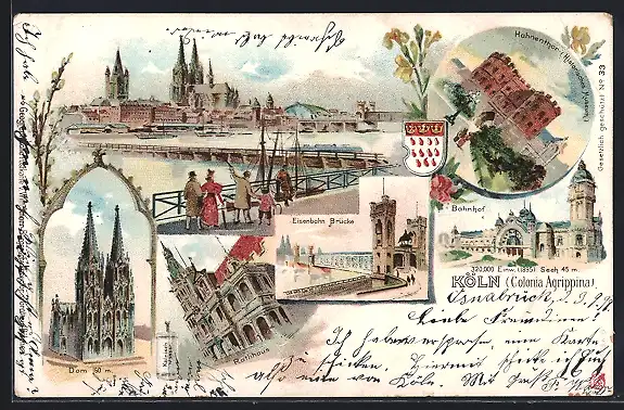 Lithographie Köln, Eisenbahn Brücke, Hahnenthor, Dom