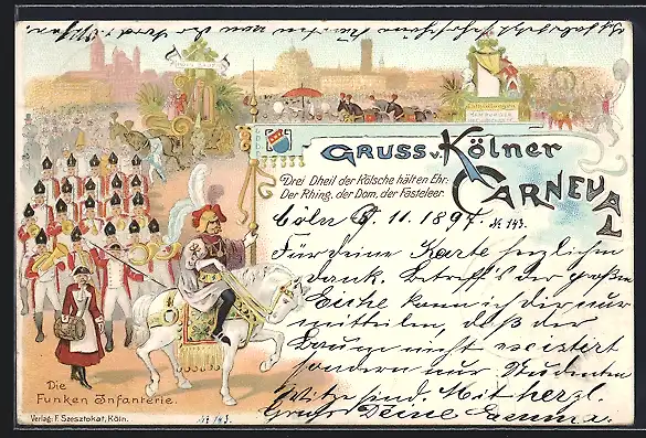 Lithographie Köln, Funken-Infanterie führt dem Umzug an, Karneval