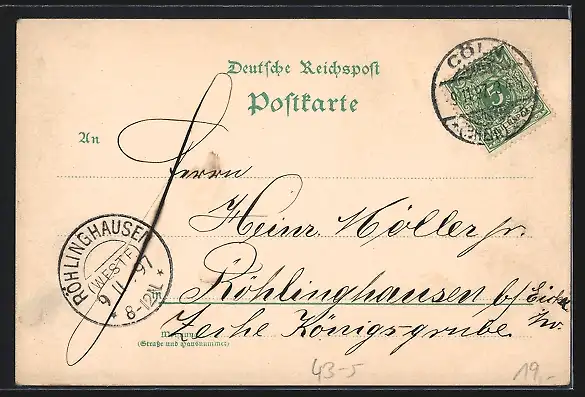 Personenbezogene Daten auf der Rückseite der Karte wurden durch blauen Textmarker unkenntlich gemacht. Die blauen Stellen sind auf die Vorderseite durchgeweicht und wirken sich negativ auf das Postkartenfoto aus
