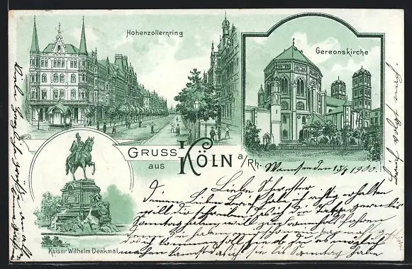 Lithographie Köln, Hohenzollernring, Gereonskirche, Kaiser Wilhelm Denkmal