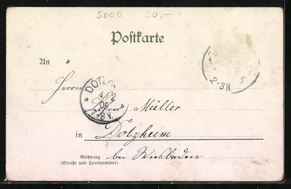 Personenbezogene Daten auf der Rückseite der Karte wurden durch blauen Textmarker unkenntlich gemacht. Die blauen Stellen sind auf die Vorderseite durchgeweicht und wirken sich negativ auf das Postkartenfoto aus