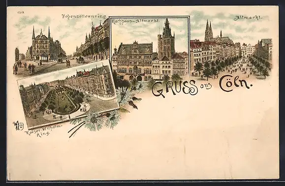 Lithographie Köln, Hohenzollernring, Rathaus und Altmarkt, Kaiser Wilhelm Ring