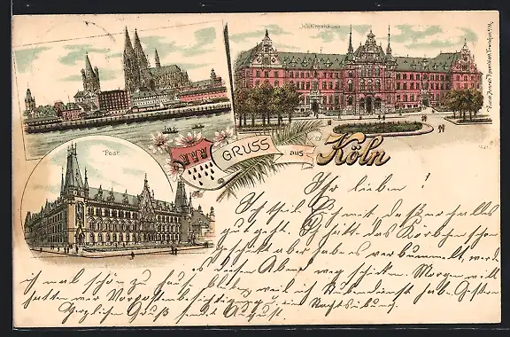 Lithographie Köln, Justizgebäude, Wappen, Post, Panorama mit Dom