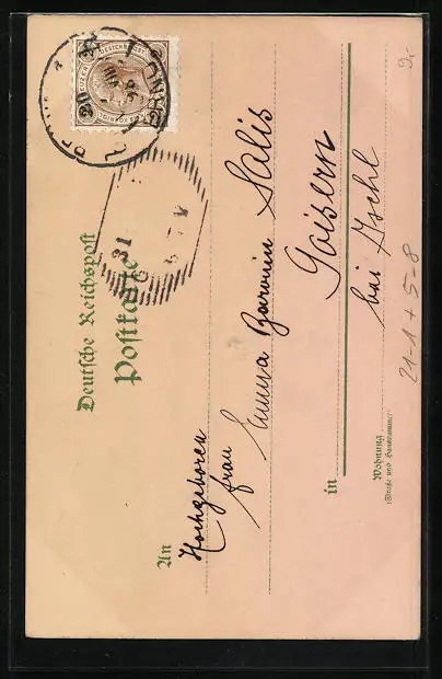 Personenbezogene Daten auf der Rückseite der Karte wurden durch blauen Textmarker unkenntlich gemacht. Die blauen Stellen sind auf die Vorderseite durchgeweicht und wirken sich negativ auf das Postkartenfoto aus