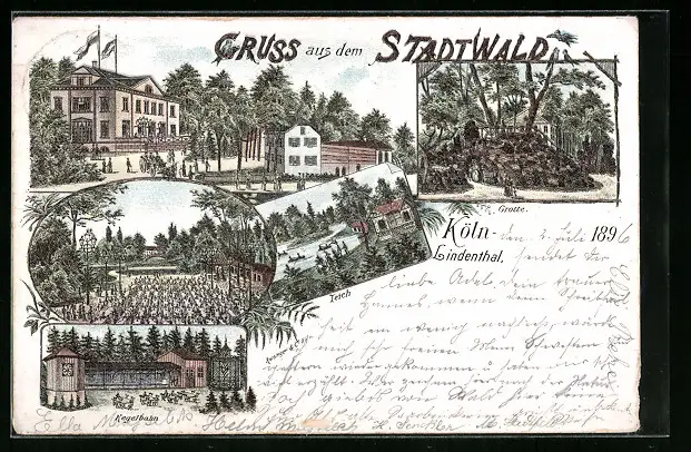 Lithographie Köln-Lindenthal, Gasthaus Stadtwald, Kegelbahn, Teich