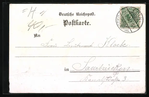 Personenbezogene Daten auf der Rückseite der Karte wurden durch blauen Textmarker unkenntlich gemacht. Die blauen Stellen sind auf die Vorderseite durchgeweicht und wirken sich negativ auf das Postkartenfoto aus