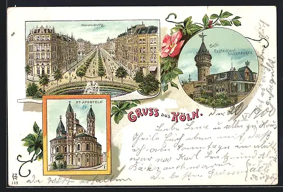 Lithographie Köln-Neustadt, Café-Restaurant Ulrepforte, Hohenstaufenring und St. Aposteln