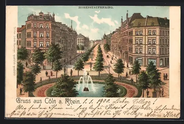 Lithographie Köln-Neustadt, Hohenstaufenring mit Springbrunnen