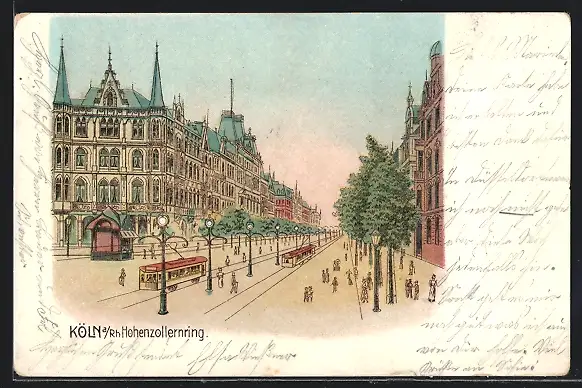 Lithographie Köln-Neustadt, Hohenzollernring mit Strassenbahnen