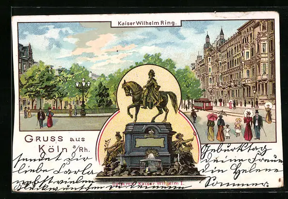Lithographie Köln-Neustadt, Kaiser Wilhelm Ring, Kaiser Wilhelm Denkmal