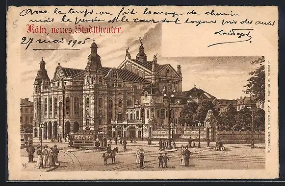 Lithographie Köln-Neustadt, Neues Stadttheater mit Strassenbahn