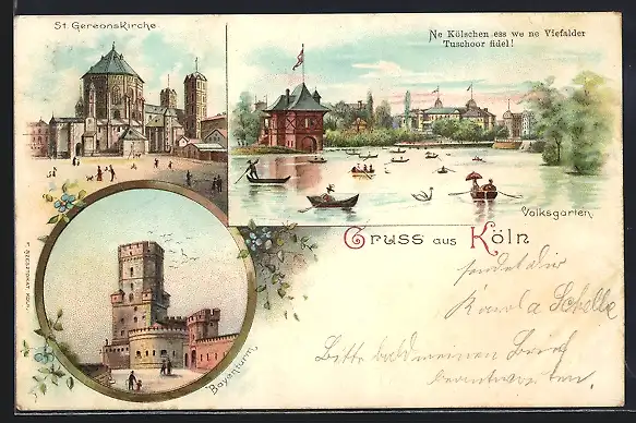 Lithographie Köln-Neustadt, St. Gereonskirche, Bayenturm, Volksgarten