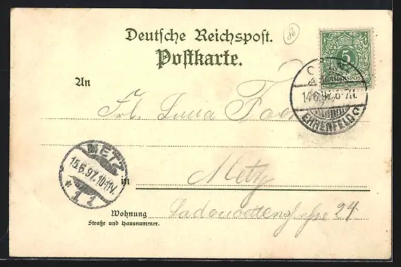 Personenbezogene Daten auf der Rückseite der Karte wurden durch blauen Textmarker unkenntlich gemacht. Die blauen Stellen sind auf die Vorderseite durchgeweicht und wirken sich negativ auf das Postkartenfoto aus