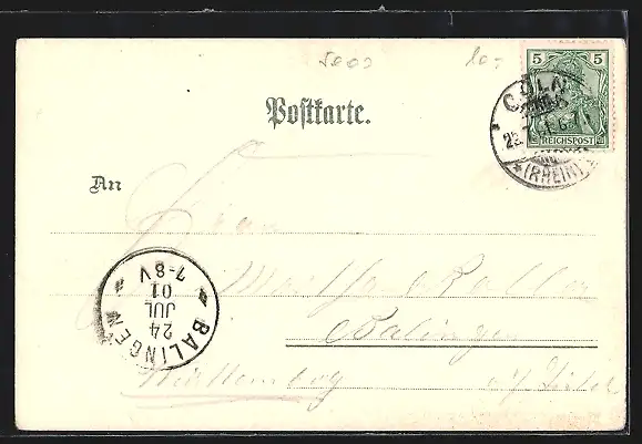 Personenbezogene Daten auf der Rückseite der Karte wurden durch blauen Textmarker unkenntlich gemacht. Die blauen Stellen sind auf die Vorderseite durchgeweicht und wirken sich negativ auf das Postkartenfoto aus