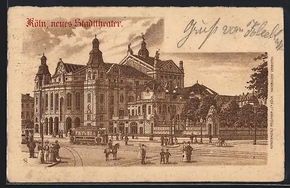 Lithographie Köln-Neustadt, Strassenbahn am neuen Stadttheater
