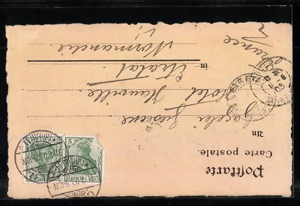 Personenbezogene Daten auf der Rückseite der Karte wurden durch blauen Textmarker unkenntlich gemacht. Die blauen Stellen sind auf die Vorderseite durchgeweicht und wirken sich negativ auf das Postkartenfoto aus