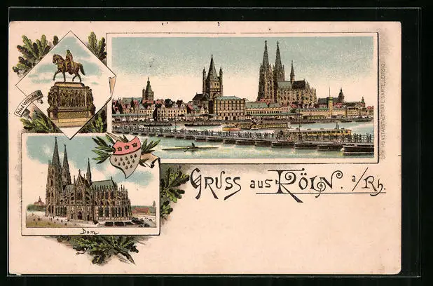 Lithographie Köln, Panorama vom Rhein aus, Dom, Stadtwappen