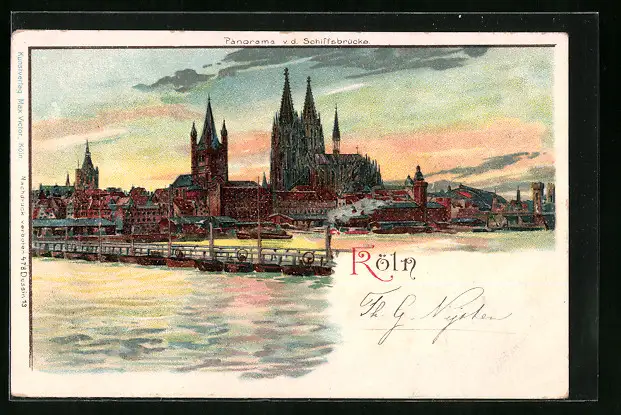 Lithographie Köln, Panorama von der Schiffsbrücke