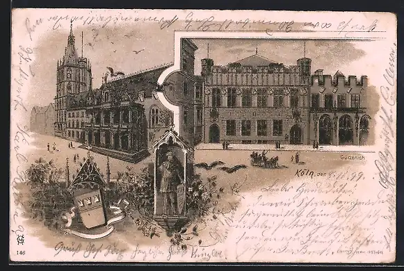 Lithographie Köln, Rathaus, Gürzenich, Wappen