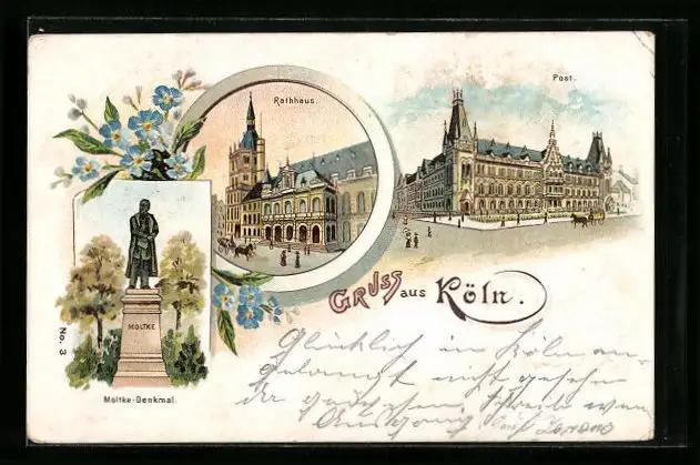 Lithographie Köln, Rathaus, Moltke-Denkmal und Post