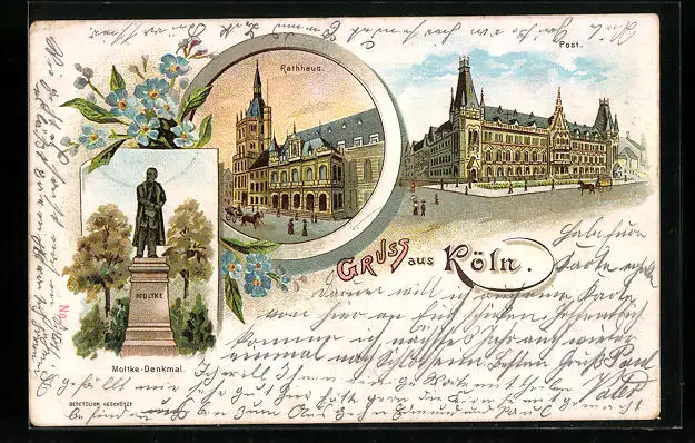 Lithographie Köln, Rathaus, Post, Moltke-Denkmal