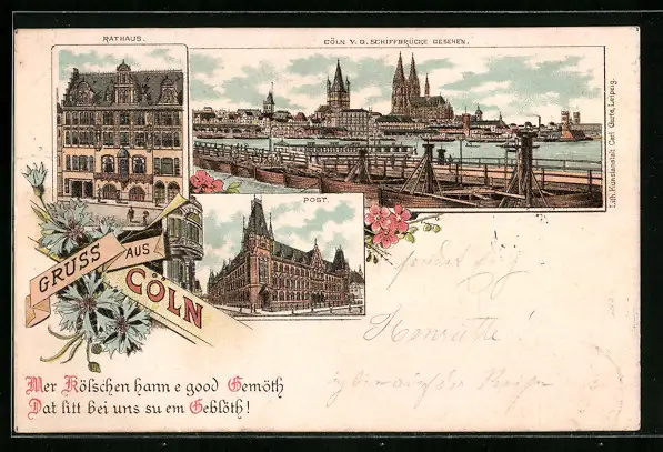 Lithographie Köln, Rathaus, Post, Schiffbrücke