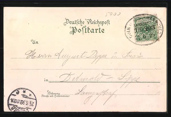 Personenbezogene Daten auf der Rückseite der Karte wurden durch blauen Textmarker unkenntlich gemacht. Die blauen Stellen sind auf die Vorderseite durchgeweicht und wirken sich negativ auf das Postkartenfoto aus