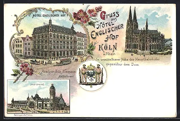 Lithographie Köln / Rhein, Hotel Englischer Hof, Haupt-Bahnhof, Dom
