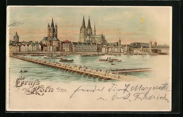 Lithographie Köln, Rheinbrücke, Dom bei Nacht, Dampfer, Halt gegen das Licht