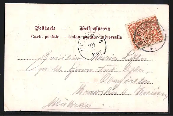 Personenbezogene Daten auf der Rückseite der Karte wurden durch blauen Textmarker unkenntlich gemacht. Die blauen Stellen sind auf die Vorderseite durchgeweicht und wirken sich negativ auf das Postkartenfoto aus